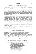 As a matter of fact most of the Missionaries’ children have such friends waiting for them; but if any have not, Colonel Winn, a member of the C.I.M. Council, and good friend of all Old Chefooites, would be glad to hear from them or their parents before they arrive, as to when they are coming, where they expect to settle, etc. He would then hope to be able to put them in touch with some friend of the C.I.M. in their neighbourhood who could give them the friendly help they need on first landing from the Far East.