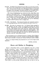 and a keen wind was blowing. Those of us who ventured out of the super-heated trains, had to cover our ears, and muffle ourselves up well. Leaving this city behind us, we reached the Prairies, where we were favoured with some glorious sunsets. Passing through the typical Canadian towns of Regina, Moose-jaw, and Medicine Hat, we came to Calgary, where the foothills of the Rockies commence. Now came twenty-four crowded hours of glorious scenery. As we wound in and out amongst the Selkirk and Rocky mountains fresh views of these stately peaks and their surroundings held us spell-bound at every turn. We simply sat there and gazed to our hearts’ content. But alas! it came to an end all too soon, and on the seventh day after leaving Halifax we steamed into Vancouver. On the following day we were transported to a camp on Vancouver Island, there to await a ship in which to cross the Pacific. After about a fortnight, the large Blue Funnel cargo-boat, Tyndareus, turned up. Some four thousand...”
