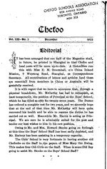“...time, Mr. Embery from the Treasurer’s Department in Shanghai offered to assist and later was lent for the Term. When things seemed to be working excellently, everyone wa;s shocked to hear that Mr. McCarthy had suffered a severe breakdown. The doctors ordered complete rest, enforced his relinquishing of the position he has held for so long and with such unique success, and strongly recommended that he and Mrs. McCarthy should leave Chefoo. This is not the place to refer to the splendid services of either Mr. or Mrs. McCarthy. Those who have been in the Schools and those who have worked with them, know what they have given to the place. No eulogy can do full justice to the services they have both rendered with such devotion and self-shcrifice to the School. Perhaps, though, the knowledge of how highly they are esteemed by “Old Boys” and their fellow labourers in the Mission will prove some reward for their abundant labours.