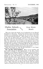 This issue closes the fourth year of publication of our Branch Newsletter in this form. During this period we have practically doubled our membership, wiped out our old deficit, and built up a strong financial position. What pleases us most, however, is the way in which those just leaving Chefoo are so readily joining up with the Association, and it is a real pleasure to see how they enter into our activities on their arrival from China. They are undoubtedly the strength of our Branch, and we are fortunate that so many of them are finding their way to England. We take this opportunity of thanking Miss E. M. Broomhall, our energetic secretary in Chefoo, for all that she is doing to interest past and present Chefusians there in the Association.