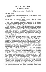 “ Old Scroogie ! ” That’s what we used to say in tones of despair, resentment, but increasing respect, in the First, Second, and Third Forms respectively. But after we left school, it was “ Dear old ‘ Scroogie.’ ” I don’t know Miss Angwin’s exact dates,—when she came to Chefoo, or when she retired,—but I do know what a no-mistake-about-it, well-established, inescapable institution she was to us kids of ten to twelve, when we were first in the Boys’ School.