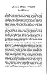One decree was made which caused much upset in Chefoo. Japanese time was to be observed throughout China, from a certain date. For a few days most people waited to see what others did, and for about a week the big firms and the bank kept to the old time. At last it was decided to comply with this regulation, which, after all, had only the same effect (in summer) as our Daylight Saving in England, and that which has prevailed during the summer months at Weihaiwei. But the school authorities felt that this would seriously affect the life of the schools, and a number of adjustments were made in the daily routine, details of which have escaped my memory. The outstanding problem about it was that of the Sunday services. Were we to march to church at what was (by the sun) still hot afternoon, or were...”