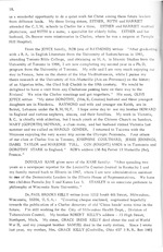 “...had not seen since Chefoo days (1941). Our almost-newDodge crew-cab (four door pickup) performed excellently with plenty of room inside for the five of us, and room in the back for our tent, suitcases, camp gear, etc. My boy is almost 16, and the girls are 9|, 12 and 14 - all very helpful along the way. Herewith some of the Chefusians we met. At Waynesville, N. C. we stayed with my indirectly related aunt, DOROTHEA FOUCAR (school nurse) and Mrs. RUTH THOMAS, one of the house-mothers at Chefoo). Washington, D. C. we put in a call to ALVIN DESTERHAFT's home and talked to his wife, GRACE WOODBERRY DESTERHAFT, as he was with some boys from his church in Vienna, Va. We also saw the senior KIDDERs who had recently returned from attending their son HAROLD'S funeral in Connecticut. Baltimore, Md. we talked briefly with their son, PAUL, in a downtown parking lot on the way to Fort McHenry. At Philadelphia, Pa. , I introduced the children to one of the real old timers of Chefoo, H. E. V. ANDREWS and...”