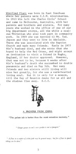 “...Winifred Platt was born in East Szechuan where her parents were C.I.M. missionaries. In 1913 Win left the Chefoo Girls' School and came to Melbourne, Australia, with her parents and brothers and sisters. For many years she worked in the office of one of our big department stores, all the while a zealous Christian who also took part in community work. In 1969 she was married to Mr. Ted. Jepson and they went to live in Adelaide. There she was associated with the Baptist Church and made many friends. Early in 1977 Win's husband died, and she wrote that she hoped to help the Red Cross, and might accept an invitation to visit a friend in Rugby, England, if her doctor approved. However, that was not to be, because 6 weeks after Win's husband's death she succumbed to double pneumonia and died on May 5th. Her many friends and two sisters still living will miss her greatly, for she was a warm-hearted loving soul. But it is only for a season, till the Day of Reunion dawns for us all and the shadows...”