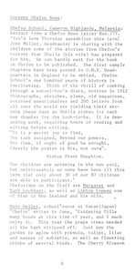 Chefoo School, Cameron Highlands, Malaysia; Extract from a Chefoo News Letter Nov./77. 'You'd love Thursday assemblies this term! John Miller, Headmaster is sharing with the children some of the stories from Chefoo's history that Sheila (his wife) has prepared for him. We can hardly wait for the book on Chefoo to be published. The first sample chapters have been posted to O.M.F. Headquarters in England to be vetted. Chefoo School's one hundred years of history is fascinating. Think of the thrill of combing through a school-boy's diary, written in 1912 Photographs, sketches, plans, old magazines, returned questionaires and 200 letters from all over the world are yielding their secrets these days as Sheila probes for each new chapter for the book-to-be. It is demanding work, requiring hours of reading and sifting before writing.