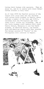As of June 1978 the English section of the school will close down and the children will attend Faith Academy in Manila, where already a number of the teen age O.M.F., children from the Philippines and from other O.M.F. fields are attending. One of the Faith Academy staff members will visit Chefoo School, Malaysia to see how Faith Academy, an American School, can better help non-American pupils whom they receive. The German section of "Chefoo" in the Philippines will continue in Baguio.