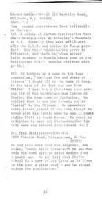 ing him if his birthplace was Chefoo or Chufoo, the home town of Confucius. He replied that it was the former, called 'Yentai' by the Chinese. He remembers every street corner of the city though he moved with his family when he was 12 years old(in 1949) to South Korea. He would be delighted to meet any Chefusians(Get his full name and address from Edward...”