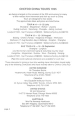 (visit the former internment camp & Columbia Country Club) Hangzhou - Moganshan - Suzhou - Wuxi - Zhenjiang - Nanjing London £1500 - San Francisco US$2350 - Melborne/Sydney AUS$3100 Plus One-week optional extensions are available for each tour