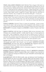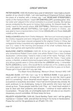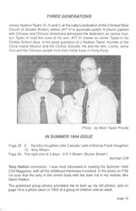 “...Board. I teach DR SAM WELLER’S granddaughter. She, her sister and I played in the school orchestra in a concert recently. We had two pieces conducted by the guest on honour that evening, Sir Edward Heath. Recently I went to the service where JOE COTTERILL (Weihsien) was ordained priest, JEANNIE (HILLS) COTTERILL had taught us history in Chefoo. Joe was glad to have a representative from China! DOUGLAS and Rosie SADLER visited us this summer.