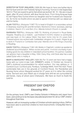 KATHLEEN (COATES) THOMPSON (1919-1924) My brother, REG COATES died December 1993, of a brain tumour. He had lived in Brisbane, Australia since aged 15. He was 82. His memories of Chefoo were all very happy ones. I am now a resident in a delightful seniors’ residence in Agincourt in metro Toronto, and love it.