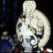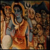 Painting of Śiva riding a bull in a procession with musicians etc, on a wall opposite the main shrine of Baṛā Hanumān Mandir