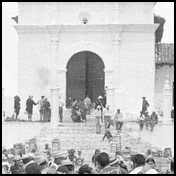 Large church building with busy market in front