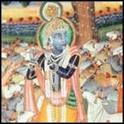Viṣṇu reclining on a serpent afloat on the primeval ocean. Above are his ten avatars and the union of Radha and Krishna